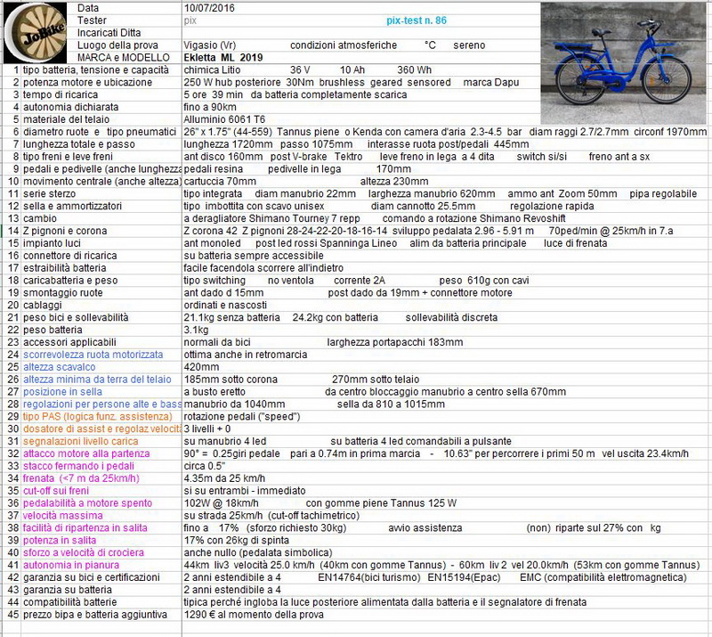 Sergiom, scusa ma non facciamo confusione: il test è relativo al modello ML con alimentazione a 36V ed impostazione cittadina Tu stai parlando dei modelli a 48V (MG ed MC)che invece hanno una impostazione turistica e li confronti con la NCM: facciamo questi confronti quando pubblicherò i test relativi