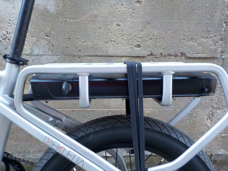 Il portapacchi posteriore è robustamente vincolato alla struttura del telaio ed incorpora il sostegno della batteria