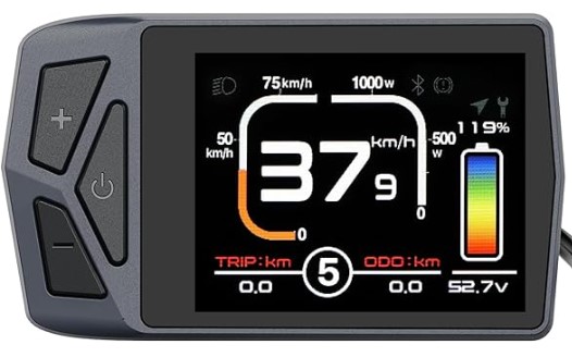 - 5 assist levels (1 extra level) - battery voltage (volts) - motor electric power (watts) - rider human power measured on pedals (watts) - motor/battery current (amps) - trip total in Watts/hour - rider force on the pedals (Nm) - pedals cadence (RPM) - brakes state