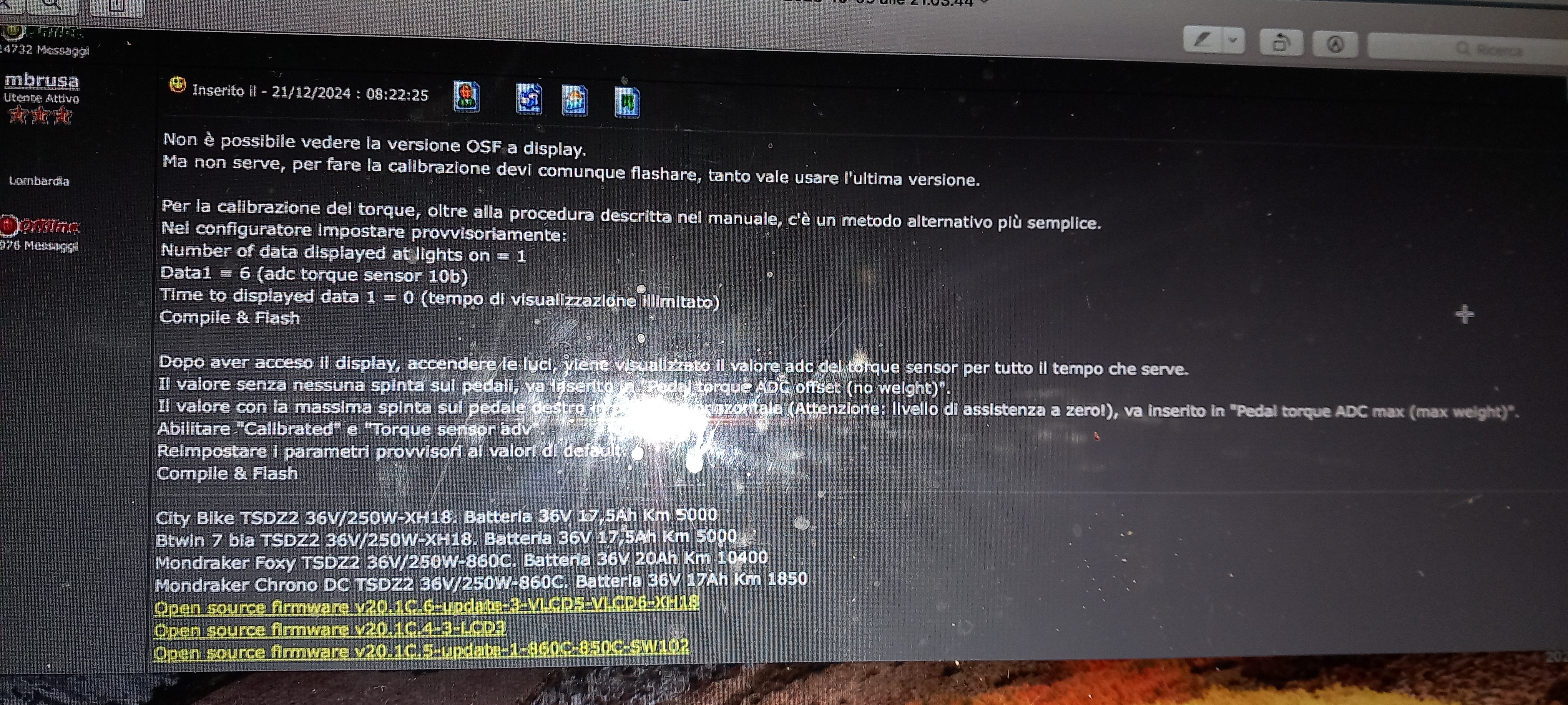 dopo aver cambiao software al mioo amico l'ho cambiato anche sulla mia... però a batteria carica segna 55,7v che è impossibile, dopo pochissimi km va a 54v e la barra invece ha già perso uno scacco...  Inoltre la mia mtb non va un tubo, si fa una fatica boia.. ho cercato calibrazione torsimetro ma non ci ho capito niente (vlcd6) adesso provo a cercare qui indietro..