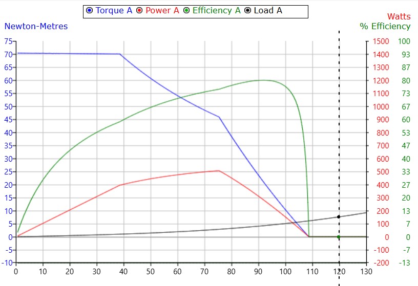 Se vuoi avere un' idea di quanta potenza se ne va in calore, guarda questo grafico ottenuto da un simulatore online. Ho inserito i dati del motore a 36V e tensione batteria di 41,5 V (completamente carica). La curva del rendimento (verde) corrisponde a quella reale, ottenuta dalle misurazioni della potenza resa (home trainer) e della potenza assorbita dalla batteria (Wattmetro esterno), senza nessuna pretesa di precisione. Nella realtà, il rendimento massimo misurato è 77-78% perché la tensione sotto carico scende sotto i 40 V. A potenza costante, il rendimento diminuisce al diminuire della tensione. Le curve di coppia e di potenza, non corrispondono a quelle reali, ma danno un'idea dell'andamento. Le perdite comprendono anche quelle meccaniche che comunque non dovrebbero superare i 25 W (stimati).