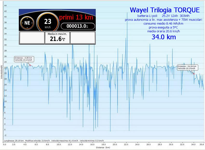 Partiamo dalla prova eseguita a livello massimo di assistenza (liv3) e con la batteria più capiente La batteria di questa taglia è da 12.5Ah (315Wh) In realtà quella che ho utilizzato era già abbondantemente usata (ottimo per vedere come si comportano nel tempo) ed aveva una capacità reale di 12.0Ah (303Wh) perciò la percorrenza ottenuta è leggermente più scarsa che a batteria nuova La velocità non è molto elevata : tipicamente 23 km/h Il cut-off tachimetrico non ha interventi invasivi e la velocità rimane ben stabilizzata senza “onde” Ho ottenuto una percorrenza totale utile di 34 km a 5°C di temperatura ambiente; a questa si aggiungono circa due chilometri percorsi a prestazioni sempre più ridotte, da considerarsi come “riserva di emergenza” Il consumo elettrico è risultato di 8.46 Wh/km Riportando l’autonomia a 20°C e considerando la capacità ridotta, si ottiene una percorrenza utile di 45 km (pari a 6.7Wh/km)