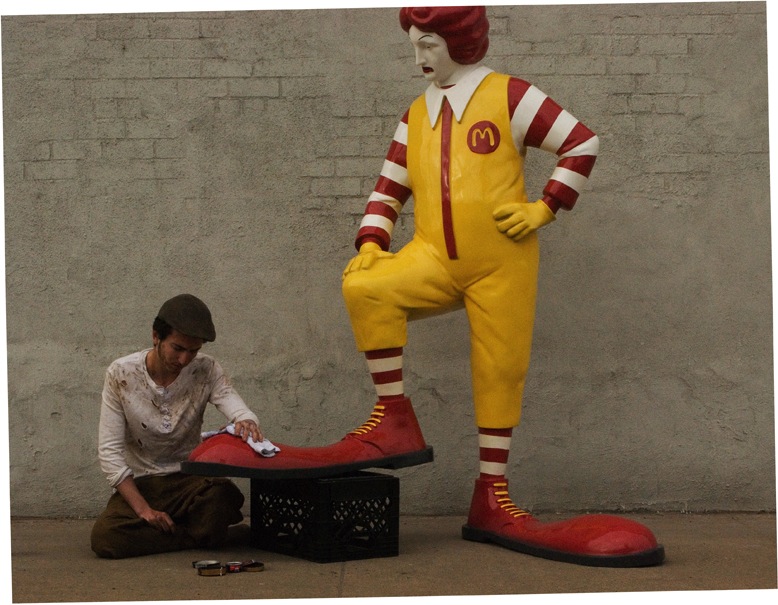 Una replica in vetroresina di Ronald McDonald a cui un ragazzino – reale – pulisce le scarpe. Per una settimana l’installazione è stata esposta all’ora di pranzo sul marciapiede davanti un McDonald’s sempre diverso. La foto è stata scattata nel Bronx.