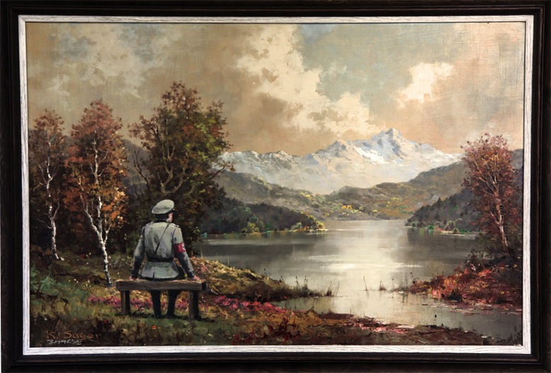 Banksy ha comprato una tela raffigurante un anonimo paesaggio in un negozio a basso costo sulla 23° strada, riportandola al negozio con l’aggiunta di un soldato nazista che osserva il panorama. Business Insider svela il nuovo lavoro di Banksy, il 29esimo a New York. “The banality of the banality of evil”,“La banalità della banalità del male” si intitola, ispirandosi alla famosa frase sul processo del colonnello nazista Adolf Eichmann. L’opera non rimarrà su una vetrina a lungo: è già pronta per l’asta con un prezzo iniziale di 76.000 dollari.