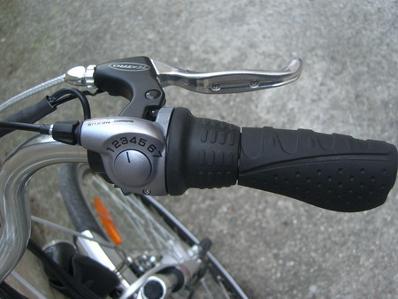 Il comando del cambio è uno Shimano Revo a rotazione, posto sulla manopola destra del manubrio, perciò nella posizione tradizionale delle bici muscolari E’ molto agevole da utilizzare e consente la scalata immediata di più rapporti