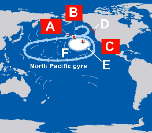N.B.- La seconda immagine con su scritto North Pacific gyre rappresenta la prima isola dei rifiuti scoperta da Charles Moore nel 1997