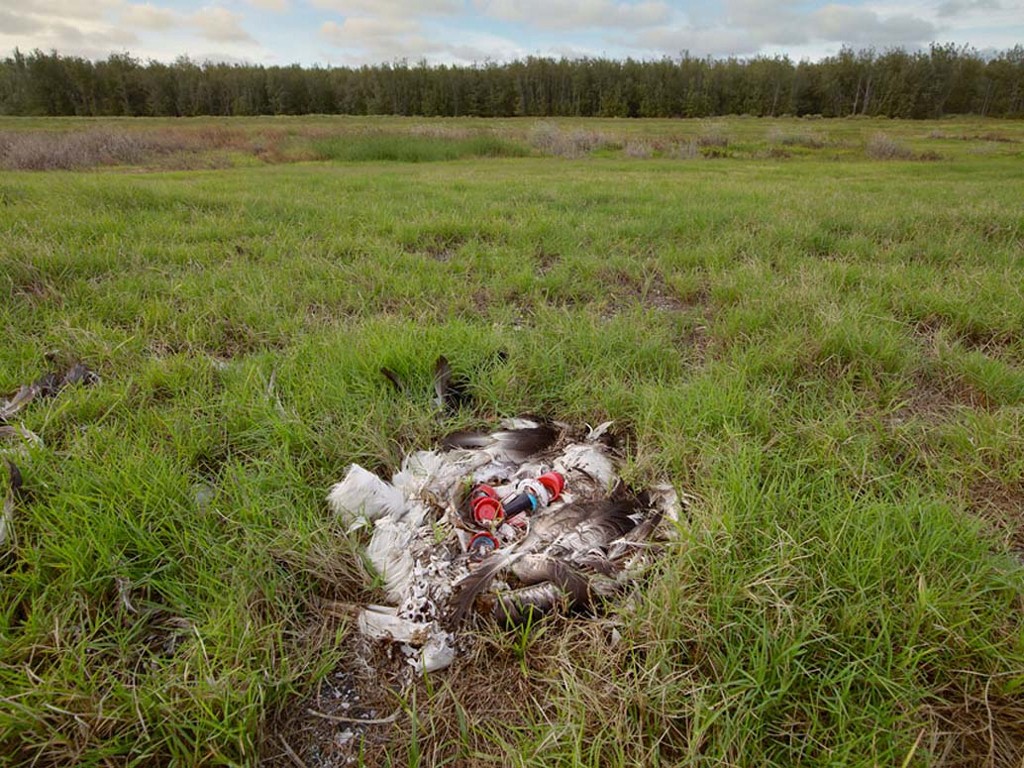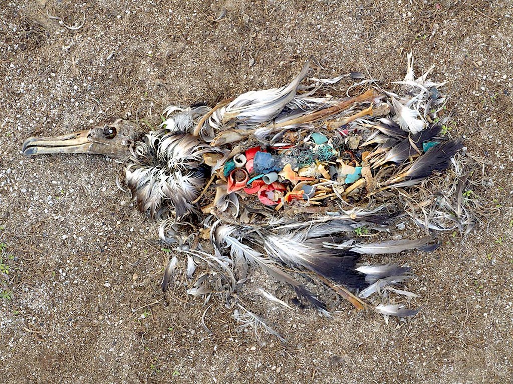 Gli uccelli acquatici, tipo gli albatros, sono particolarmente attratti dai tappi di plastica delle bottiglie e spesso dopo averli inghiottiti vanno a morire a terra lasciando come unica traccia della loro esistenza il contenuto del loro stomaco, tappi di bottiglia ed altri pezzi di plastica. Il fotografo Chris Jordan ha documentato i pasti a base di zuppa plancton-plastica della fauna della zona, nel suo ultimo lavoro Midway, Message from the Gyre si può vedere realmente quello che sta accadendo.
