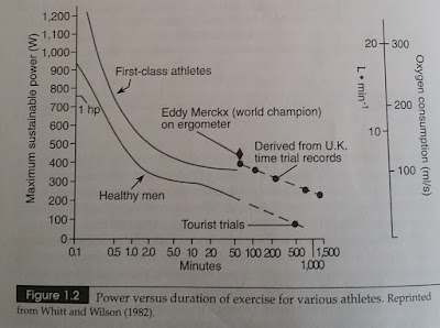 Dal grafico si evince che un uomo in salute, in un'ora, riesce al massimo a produrre una potenza di 150 Watt ovvero un'energia di 150 wattora, Eddy Merckcx, campione del mondo di cicloergometro arrivò a 450 wattora ovvero circa mezzo kWh.