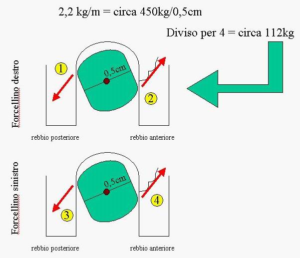 Spero di non aver detto una corbelleria, l'idea è questa, che poi si rompano davanti credo sia dovuto alla maggior leva come ha già detto qualcuno. Tutti questi kg pero' se la ruota è libera di girare finiscono alla ruota, non ai forcellini (l'asse si puo' tenere fermo anche con 2 dita). Io penso all'elicottero che per non farlo girare su se stesso basta la piccola elica di coda, ma se qualcosa blocca le pale, chi lo ferma?