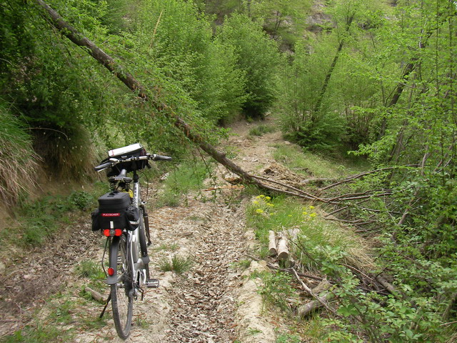 Sono così riuscito (si fa per dire) finalmente a mandare in blocco il panasonic su questo sentiero dalla pendenza esagerata... ho messo prima e turbo, ma ad un certo punto ho dovuto alzarmi sui pedali e il pansonic si è ribellato spegnendosi...