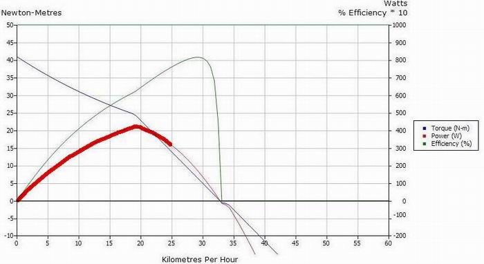 Si vede bene in questo grafico del Crystalyte 408, dove ho evidenziato in rosso la potenza fino a 25km/h (ma le curve sono simili per tutti i nostri motori)