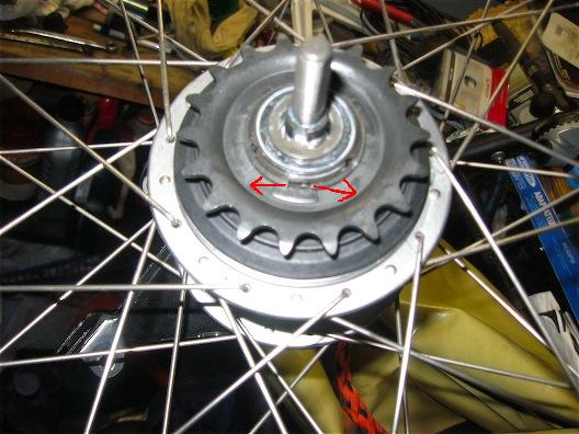 foto 1: rimozione ruota posteriore, stiamo staccando il cavetto del cambio foto 2: come si presenta il mozzo dopo il solo smontaggio dalla bici, i pois multicolori (lo scopriremo più tardi ma già lo sospettavamo... ) non hanno funzione decorativa. Svitare il dado zincato con chiave da 17 tenendo fermo il perno ruota con chiave da 8. foto3: ora il "robo in ferro stampato nero che trattine il terminale a pipa" della guaina del cavo del cambio è libero (quello tra le mie dita) e sollevandolo si porta con se la rondella nera sagomata con la scritta lock e quella cromata "semiquadra". Levate tutto ma achtung: quando rimontate notate che ogni innocua (magari) rondellina-spessore ha sempre una forma che deve incastrarsi in qualche dentino quindi fare con calma e pulire dal grasso... foto 4: tolto il "robo in ferro stampato nero che trattine il terminale a pipa" si presenta così e si vorrebbe chissà quale estrattore per procedere invece basta sollevare i pezzi cromati che vedete in foto 5 foto 5: togliere l'anello in plastica nero sagomato, parapolvere, sollevandolo semplicemente foto 6: pignone malefico sei finalmente mio! foto 7 vedi foto modificata che segue: piuttosto che infierire con ogni arma a disposizione condendo il tutto abbondantemente da colorite espressioni come abbiamo fatto noi (signore escluse) sappiate che giunti qui il pignone è trattenuto solamente dal seeger (anello elastico metallico) che deve essere allargato con una pinza da seeger di quelle che allargano i becchi (a trovarla nel casino generale...) stringendo come indicato dalle frecce rosse ed il pignone è libero!