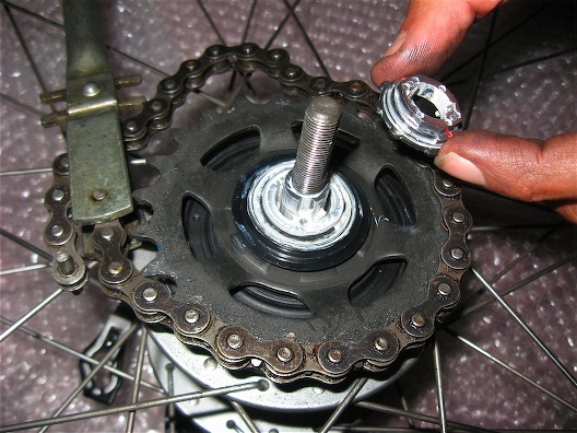 Se è come sui cambi interni SRAM (SACHS) basta allargarlo e viene via ma fai attenzione al verso delle varie "rondelle" poichè vanno messe in un senso o nell'altro secondo il numero dei denti del rocchetto.