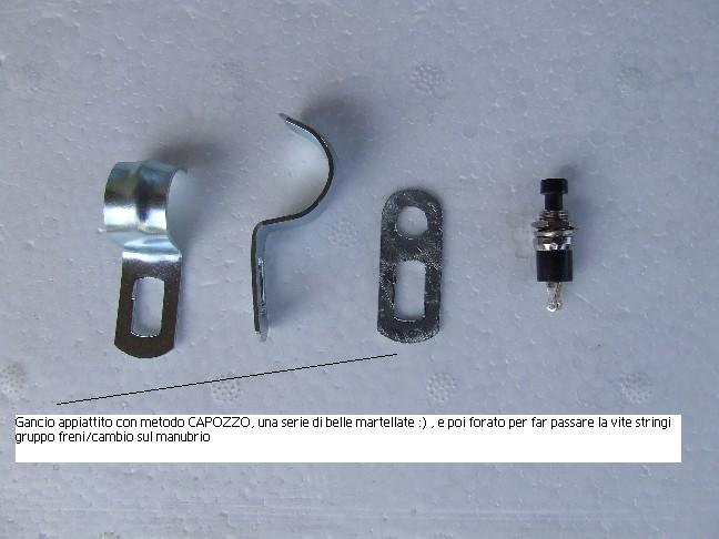 Cosa serve: 1 - ganci fischer 2 - un bel martellone 3 - trapano con relativa punta (diametro pari alla vite serra gruppo freno/cambio sul manubrio) 4 - saldatore a stagno 5 - filo elettrico bifilare 6 - pistolla per colla a caldo 7 - interruttore o pulsante elettrico 8 - un tubicino di plastica o guaina termo-resringente 9 - una buona dose di pazienza :)