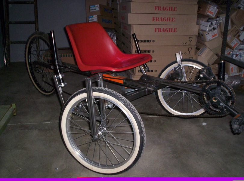 Il trike come dicevo è ancora in costruzione, devo ancora installare definitivamente il comando freno e cambio, il tendicatena ed i passaggi catena protetti, e devo finire il sedile, quello definitivo sarà più inclinato e con lo schienale più lungo. Lo uso già così comunque per provarlo, non su strada ovviamente. adesso tutte queste cose sono smontate per finire le saldature sul telaio e montare i freini ed il sedile.