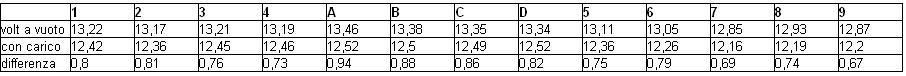 ho caricato tutte le batterie, ho misurato il voltaggio a vuoto, poi una ad una è stata sottoposta ad un carico di una lampadina da 12V che però non aveva alcuna dicitura nè sul bulbo nè sul supporto metallico, per cui non saprei dire quanti watt assorbe (dovrebbe essere una lampadina per auto, forse quella di posizione).