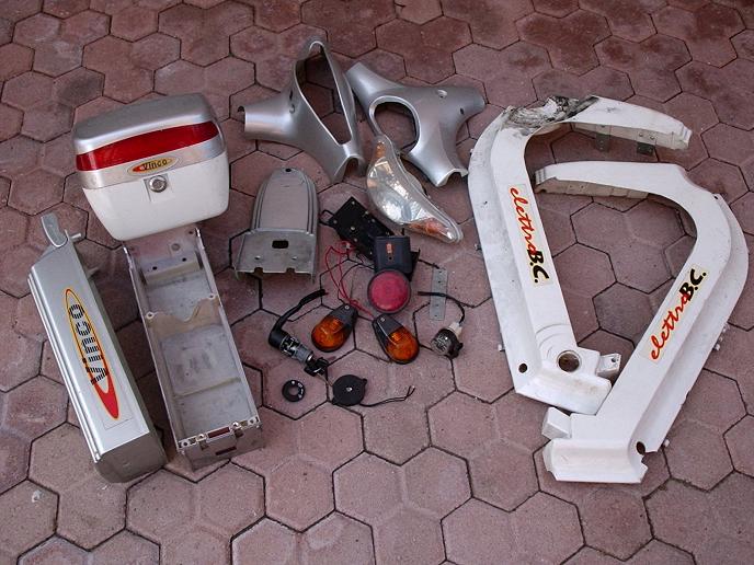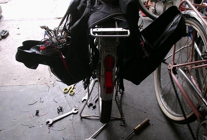 Ho comprato 2 zaini da 5 euro ciascuno da decathlon anzichè le borse laterali che mi sarebbero costate 35 euro e le ho fissate al portapacchi posteriore, in uno zaino ci ho messo due batterie mentre nell'altro ho inserito una batteria, la centralina, l'ex cruscotto e i vari collegamenti cioè un interruttore (prelevato da un vecchio phon) per alimentare il tutto e ho tolto il vecchio interruttore a chiave che pesava un sacco, poi ci ho messo l'attacco per la ricarica e il portafusibile.