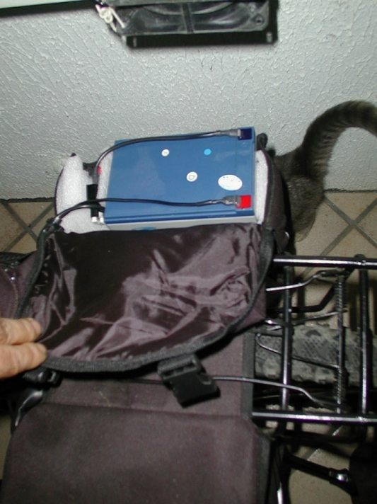 Aggiornamento trasformazione : ho provato a mettere le batterie sul portapacchi per capire se l'effetto sbilanciamento diminuiva ed in effetti è migliorato e ho deciso di fissarle così, per combinazione avevo in casa uno zainetto nero che da tempo non utilizzavo... è incredibile sembra fatto apposta per ospitare 3 batterie al pb da 7Ah.