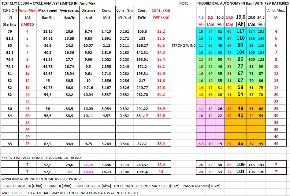 Commenti: dato il mio scopo, ho evidenziato con un azzurro “Paradiso” gli amperaggi utili a fare lunghe gite. In verde invece gli amperaggi medio-bassi che sono il compromesso tra ottima autonomia e ottime prestazioni. Faccio notare infatti che con 10-12 A massimi si ottengono velocità massime di tutto rispetto per una bicicletta e medie di percorrenza vicinissime alla “superbike” da 45A. Con il vantaggio del minor consumo e della maggiore autonomia. Giallo valori medi sufficienti a provare l’ebbrezza dei 50 km/h. Dopo di ciò valori da “competizione”; che comunque, viste le medie che danno, non credo che utilizzerò in futuro. Per quanto mi riguarda, hanno solo senso a fini “sperimentali” (per utenti come me), tanto più che la velocità massima a 45A penso potesse essere anche maggiore, ma non avevo voglia di rischiare oltre per “sacrificarmi per la scienza”. E poi, al massimo sarei arrivato in ufficio con 10 secondi di anticipo.