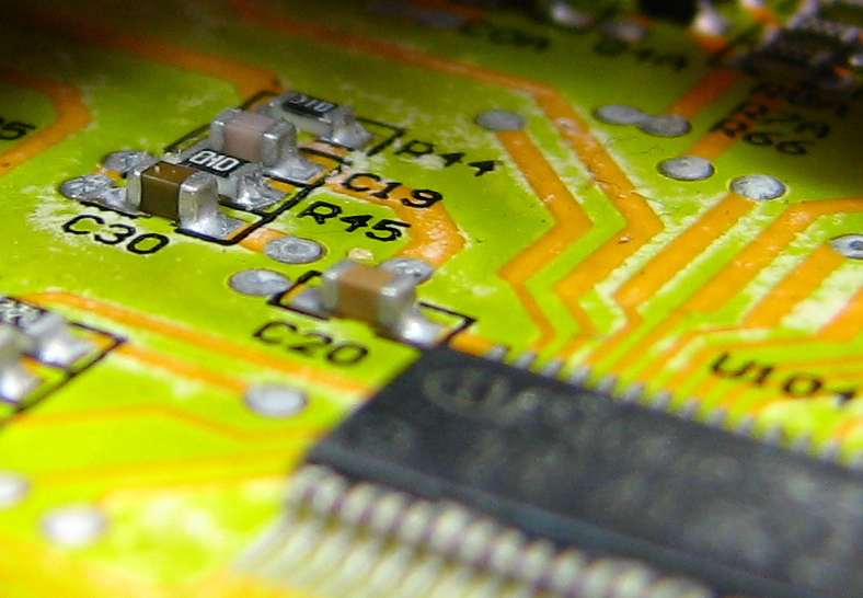 c'è di fianco un condensatorino, davanti una pista 1 po piu larga, dietro un chip in smd piccino !