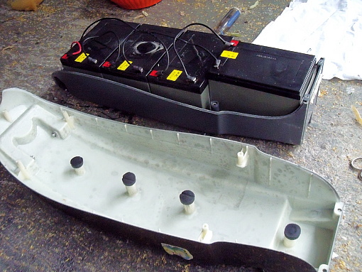 ok,intanto ho posizionato l'acceleratore poi ho aperto per la prima volta il contenitore delle batterie della mia bici elettrica(48V)per vedere se riuscivo a utilizzare 3 batterie(36V)per fare una prova solo che ho visto che i fili sono saldati a stagno e non me la sono sentita di tagliarli per poi risaldarli,per curiosità qualcuno sa cosa vuol dire la scritta sulla batteria? [6dzm-10(2hr)] da notare i 4 spuncioni con il finale in gomma per tenere pressate e quindi ferme le batterie quando il contenitore è chiuso,per l'utilizzo del piombo non ho dubbi (in base alle mie esigenze) e penso che i venditori dovrebbero pensare seriamente a mettere in catalogo delle batterie al Pb gia' assemblate complete di caricabatteria;per me questa realizzazione è un'esperienza,sono curioso di vedere come andrà a finire,per fortuna assemblarmi questa bici non è una necessità quindi non ho nessuna aspettativa,poi avevo già in mente di kittarla quindi mal che vada avrò le batterie nuove a cui aggiungere un kit nuovo.