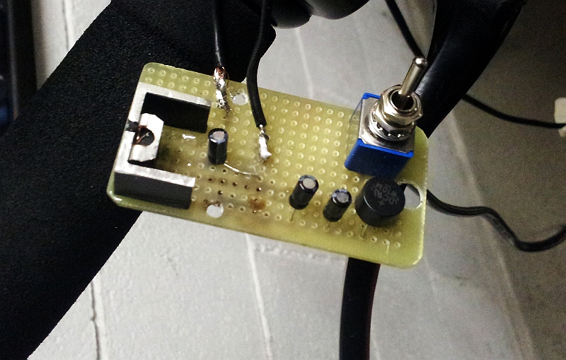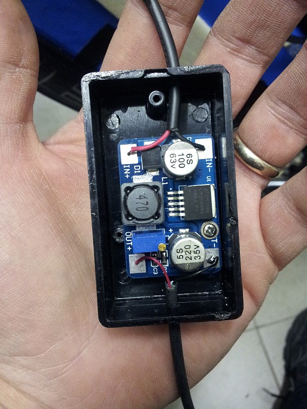 Tornando al progetto, il tutto saldato su piastrina millefori, con uscita cavo micro usb (fili rosso e nero), opportunamente inscatolato (sta dentro il vano batteria / centralina) e deviatore isolato a tenuta stagna.