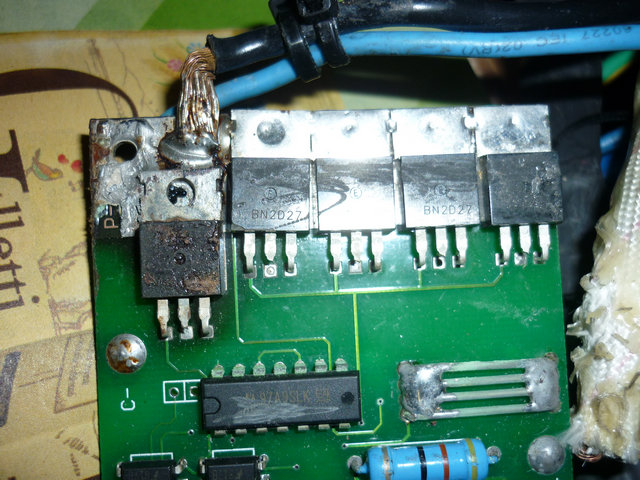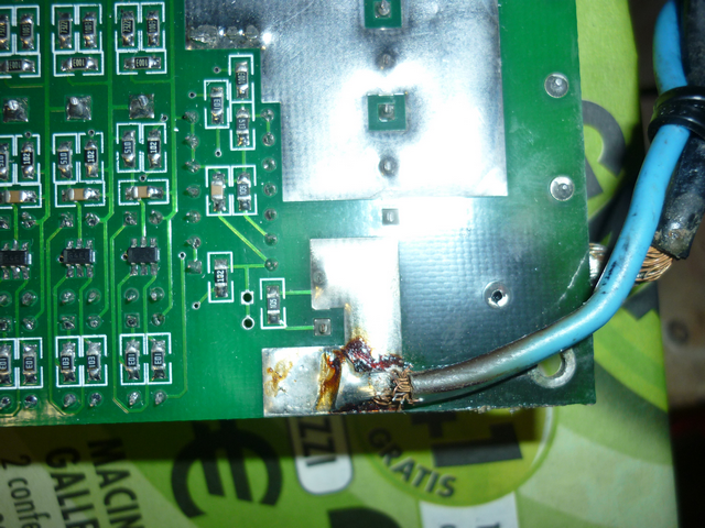 Io di elettronica non sono pratico, ma dalle prime due foto, vedo che la pista dove è collegato il cavetto celeste, sembra parzialmente interrotta, cosa che potrebbe provocare un surriscaldamento in quel punto. Sulle due seconde foto noto un componente che si trova sempre accanto al cavetto celeste, che è annerito, a mio parere il surriscaldamento viene proprio da quel componente. Non si se si tratta di un Mosfet, ma sicuramente gli esperti d elettronica potranno valutare meglio di me se il surriscaldamento è causato proprio da lui. |