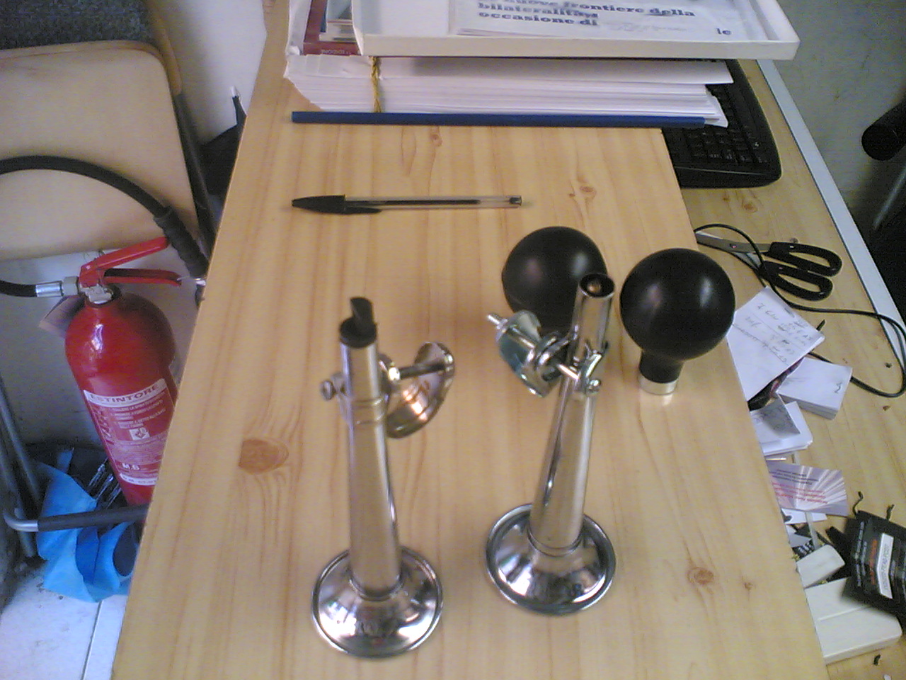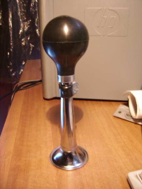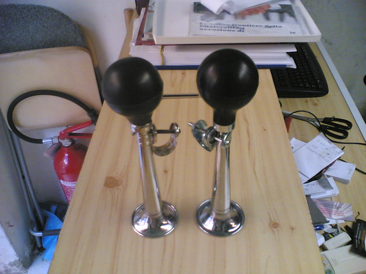 eccole qui, un paio di trombe da bici, cosi' uguali ma cosi' diverse. scrivo questo mini report per mettervi a conoscenza di quello che mi e' accaduto: la mia ragazza mi regala una di queste trombe comprata da decathlon, tutto perfetto, finche', un bel giorno me la rubano. tagliando corto, me la ricompro e la smonto per vedere meglio come posso bloccarla ma, ovviamente la rompo. (all'interno c'e' un lamierino di ottone o rame, che con il passaggio dell'aria vibra lasciando uscire il classico suono da tromba. a forza di metti e leva per fare le prove per bloccarla ho piegato il lamierino e emetteva solo una pernacchietta piccolissima. dopo ore di prove e di addrizzamenti del suddetto lamierino ho abbandonato. scusate le parentesi cosi' lunghe) la ricompro su ebay e la monto, noto subito una differenza: se il movimento dello strizzare la pera non e' precisissimamente omogeneo la tromba suona sblaterando, come quando si grida senza voce. allora l'ho smontata e ho notato che il sistema all'interno non era uguale a quello precedente ( e immagino neanche a quello ancora prima che mi hanno rubato e che non so come era fatta dentro):
