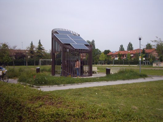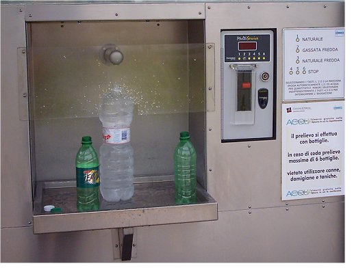 oggi passando da fidenza (provincia di parma) mi sono riempito qualche bottiglia con l'acqua gasata,accludo un paio di foto della fontana ed un link: http://parma.repubblica.it/dettaglio/Acqua-liscia-e-gassata-alla-fontana-del-futuro/1493837?edizione=EdRegionale so che ne esistono anche in altre citta',i pannelli solari servono per far funzionare un frigorifero che raffredda l'acqua,le sbarre e le telecamere per proteggerla dai vandali,il servizio e' gratuito.