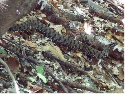 anche in montagna non sono tutte rose e fiori,qualche giorno fa mentre facevo trekking dopo 4 ore di cammino ho trovato il sentiero ostruito da alberi tagliati e non c'era modo di aggirarli così con difficoltà ci sono comunque passato in mezzo per non dover tornare indietro dato che facendo un giro ad anello ero ad un ora di strada da dove ero partito,poi sento al mio fianco un soffio forte e continuo come di una ruota bucata che si sgonfia,mi son detto:ma come ho fatto a bucare che sono a piedi? mi volto e vedo questa vipera.