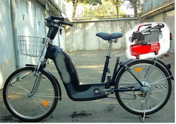 posto un fotomontaggio ed un disegno,le bici ed i compressori elettrici che comprimono l'aria in un serbatoio esistono di gia',l'anello mancante per avere una bici ad aria e' la creazione di una ruota per convertire la forza dell'aria in movimento della ruota e quindi della bici,un compressore come quello in foto viene 80 euro,ha un serbatoio da 25 litri,pesa 16kg e sviluppa una pressione di 8 bar,c'e' qualcuno che in qualche modo riesce a convertire i bar in watt anche se sono due cose diverse? perche' se 8 bar possono avere una corrispondenza da 250 watt in su si puo' proseguire,se invece sono di meno ci abbiamo comunque provato;la ruota a cui pensavo e' schematicamente come quella del disegno,un tubo che soffia l'aria sulle palette e che dopo aver fatto il giro torna nel serbatoio per poter essere riutilizzata dato che la ruota sarebbe carenata ed a tenuta d'aria.