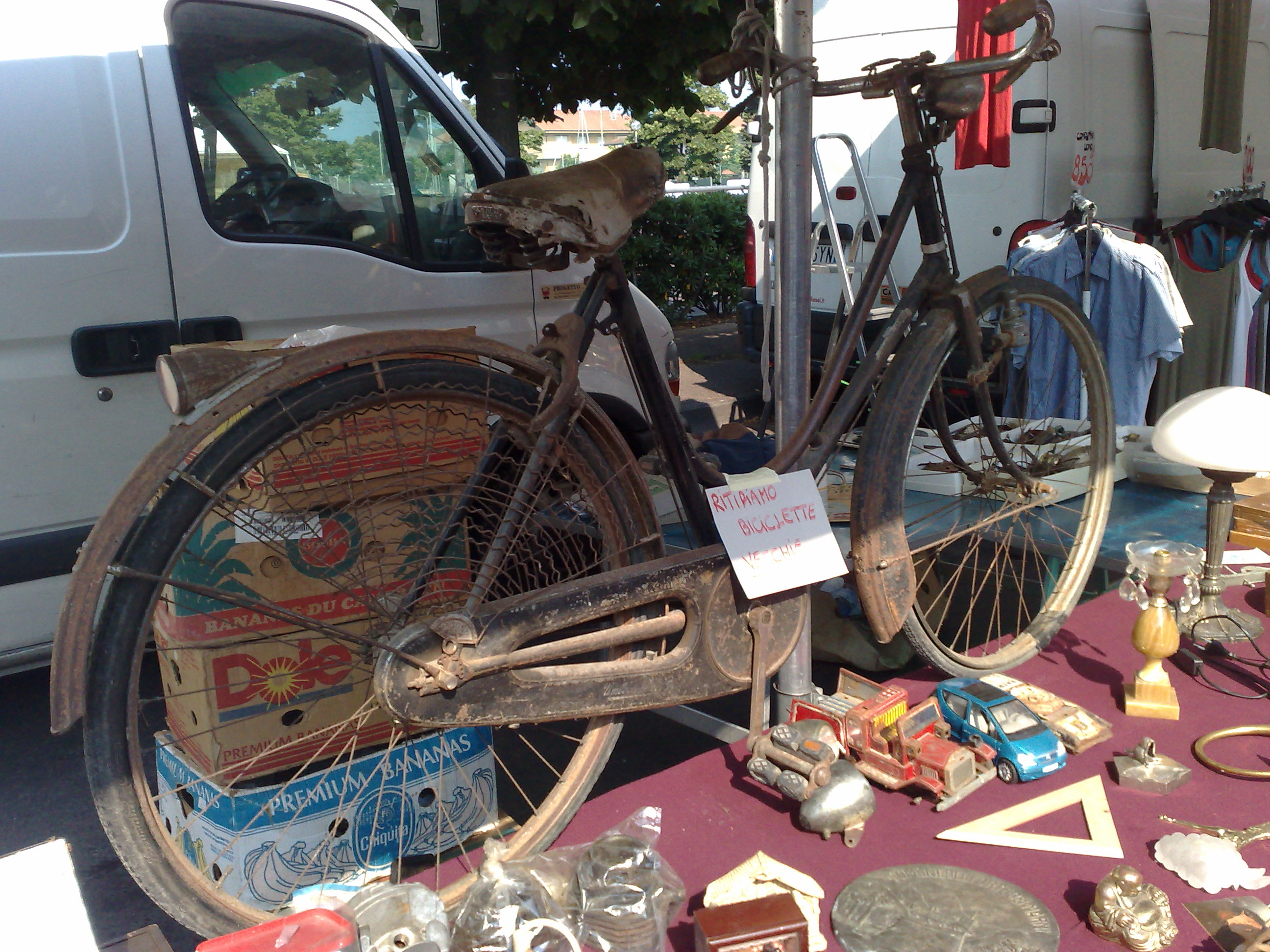 Sono stato in vacanza a Viareggio. Mi sono divertito, ho visto bei posti e il tempo è sempre stato (per fortuna) bello. Sicuramente le biciclette elettriche sono più diffuse che a Trento. A Viareggio sono molte le persone di una certa età (ma anche giovani)che ne possiedono una anche perchè... sono poche quelle che pedalano e moltissimi quelli che sfrecciano accelerando con la loro bipa/motorino! Io oramai mi sono abituato a pedalare e non mi dà fastidio (anzi mi serve per fare un pò di movimento); però non mi piacciono le differenze di "trattamento". Qui da me se non pedali (e sono veramente rari coloro che non lo fanno) rischi realmente il sequestro del mezzo...Ricordo bene quando, alcuni anni fa, le biciclette/motorino non a norma sono state sequestrate qui a Trento per un anno o forse più. Lì invece quasi tutti scorazzano allegramente con i loro piedi ben fermi. Molto probabilmente le biciclette escono dalla fabbrica a norma e poi (immagino) sia il rivenditore che esegue la "modifica" (non riesco ad immaginarmi la vecchietta 75enne che armeggia con la centralina per modificare la sua bicicletta elettrica). Comunque sia mi sono divertito a vedere e cercare i modelli che erano diffusi lì e anche (ero in bungalow in campeggio) quali biciclette pieghevoli (compresa la mia Born2ride) i camperisti si erano portati appresso (ho visto per esempio una pieghevole carina che aveva solo un adesivo "On the road"; un'altra, anche abbastanza carina, che aveva impresso il nome "Matra, Street cat"). Altra piccola nota negativa è che lo scontrino non lo faceva nessuno e dovevi sempre chiederlo (ieri sera l'ho dovuto chiedere anche in una pizzeria e la titolare prima lo ha battuto a costo zero, poi lo ha rifatto e si è sbagliata nel digitarlo, tanto era abituata a rilasciarli!). Per chi fosse interessato inoltre al mercato del mattino di martedì ho trovato questo cimelio un tantino arrugginito...
