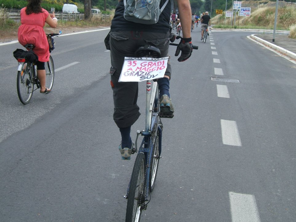 S.U.V. vorrebbe dire Sport Utility Vehicles, ma i SUV sono inutili: non hanno prestazioni fuoristrada e vengono usati prevalentemente in cittˆ. La tecnologia permetterebbe la produzione di automobili efficienti e meno inquinanti, ma le case automobilistiche spingono i modelli pi pesanti e inquinanti. Cos“ le automobili diventano sempre pi inquinanti e pericolose, ai danni dell'ambiente e degli utenti della strada, specie i pedoni. Il peso elevato e il baricentro dei SUV alto moltiplicano la forza d'inerzia togliendo controllo in velocitˆ. I SUV emettono una gran quantitˆ di gas serra.