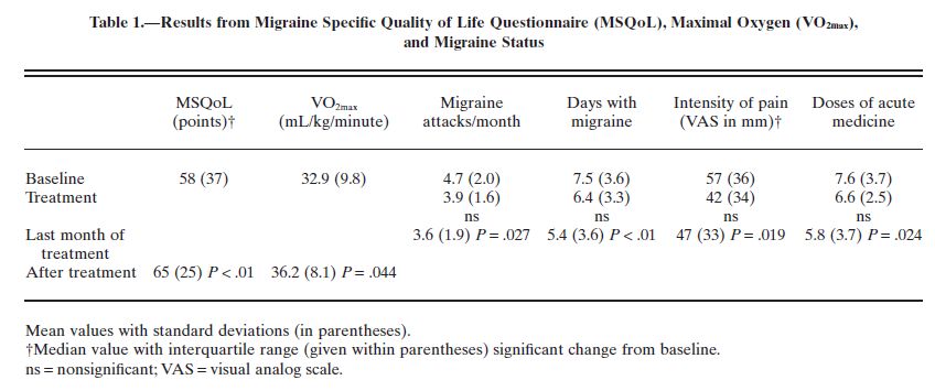 Piano ... Leggendo l'intero articolo su Headache gli autori riportano una riduzione del numero degli attacchi di emicrania da una media di 4,7 al mese prima del trattamento a 3,6 nell'ultimo mese di trattamento, oltre al miglioramento di altri parametri (riduzione di intensità del singolo attacco, riduzione della quantità di farmaci assunta, miglioramento della qualità di vita, etc.). Buon risultato, ma purtroppo non la riduzione di frequenza del 90%. Una cosa interessante, comunque, è che l'esercizio fisico così strutturato non si sia comportato da trigger per nuovi attacchi, come temuto da molti emicranici.