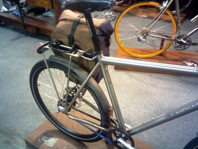 Quella che mi ha colpito di più è questa crisp titanium 69er (26 dietro, 29 davanti) da viaggio in titanio, con trasmissione a cinghia    Mi spiace solo per le pessime foto che le ho fatto che non Le rendono giustizia!
