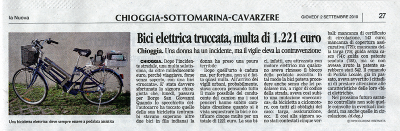 quoto; anche la didascalia della foto dice "Una bicicletta elettrica, ecc..." e hanno preso il prototipo della space bike con pila atomica incorporata tempo fa era capitato a un ciclista padovano, anche là uno che gira a manetta senza pedalare: è ovvio che ti sgamano subito! Inoltre senza l'ICI e con la fame di soldi che hanno, i comuni vanno proprio a raschiare il fondo del barile.  Per carità, la legge è legge e va rispettata(dura lex sed lex: una citazione che mi è sempre stata sulle scatole) però 1,2 keuro per simile cazzata mi sembra un'assurda e perversa esagerazione: allora a quello che corre a 200 in autostrada dovrebbero segare la macchina a metà così arriva al massimo a 100 all'ora. Io sono fra quelli che pensano che la legge in fatto di e-bike andrebbe ritoccata se vogliamo incoraggiare la gente a lasciare a casa l'auto e preferire mezzi ecologici e salutari PER TUTTI. Così si mettono solo i bastoni (metaforicamente e non) fra le ruote. |