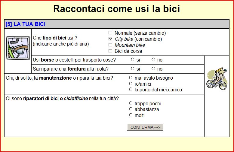 mi fa piacere che ci chiedano di collaborare e invito tutti a farlo, però... nei tipi di bici semplicemente non ci sono né elettriche né pieghevoli! e poi per chi come me vive in un comune dove non ci sono ciclabili non c'è modo di segnalarlo ed è difficile cavarsela con le domande...0 insomma, un'altra volta magari ci avvertono prima e gli diamo pure una mano  |