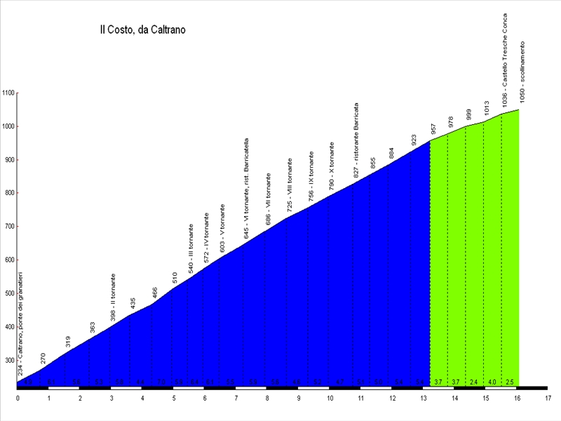 In effetti c'è solo la parte iniziale (Costo) che va presa con le molle: 15Km di salita con pendenza media del 5% circa (= + di 1 ora di pedalata abbastanza impegnativa) ... ma per il resto mi sembra OK! Quindi credo che lascierò la rapportatura 14-21 ...