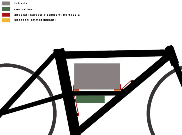 I pezzi in rosso saranno realizzati da me in ferro usando degli angolari e saldando dei supportini appostiamente forati per i buchi dei portaborracce, sotto di essi (in giallo) vorrei mettere del materiale smorzante, ma ancora non ho trovato cosa. La batteria ovviamente è in grigio, mentre in verde si vede la centralina. Ho pensato di ricoprire la batteria con della guaina liquida per "stagnarla", i cavi ovviamente saranno racchiusi in una guaina termorestringente. Alla batteria applicherò un manico o una tracolla.