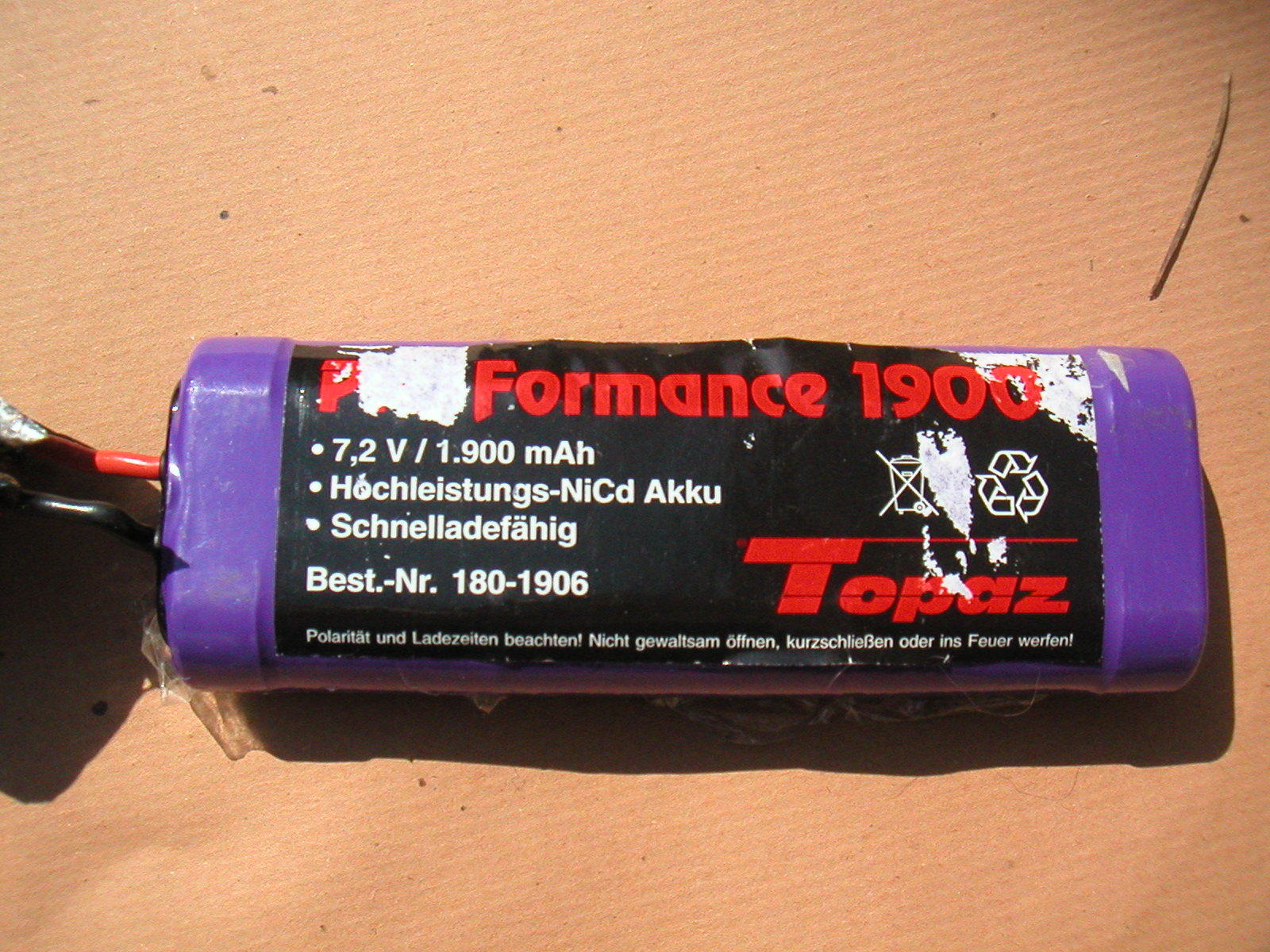 i pacchi sono 40 da 6 batterie ognuno, la sigla e Pro Formance 1900 la marca e' Topaz 7.2V / 1,900 mAh hochleistungs-NiCd Akku schnelladefahig Lui Caricava con il caricabatterie cristalite da piombo da 36V in due pacchi, e aveva controllato che qundo iniziava a scaldare staccava. Si regolava con un temporizzatore sul caricabatterie. |
