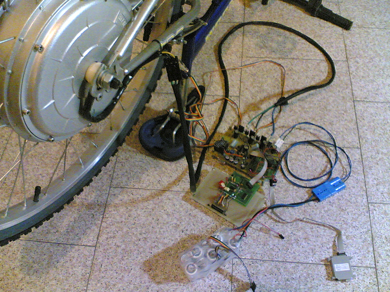 709,32 KB La foto mostra il controller del motore (5304) senza aletta di raffredamento, in quanto provo con basse correnti. Sono anche visibili il BMS delle batterie LIPO e un pacco di 10 batterie A123. La foto non mostra invece il sistema di ricarica da 700-100watt delle batterie, che ho intenzione di realizzare in seguito.