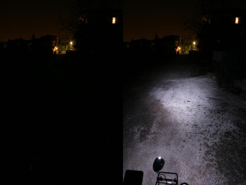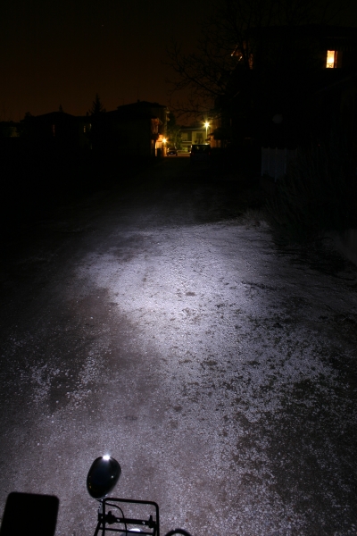 Lo ho provato e, credetemi: fa proprio una bella luce. Non come una macchina, però, per il solo consumo di 17mA, direi che fa una valanga di luce. L'originale vetrino del faro da bici, caratterizzato da quelle fasce verticali, mi allarga il cono di luce, altrimenti un po' stretto.