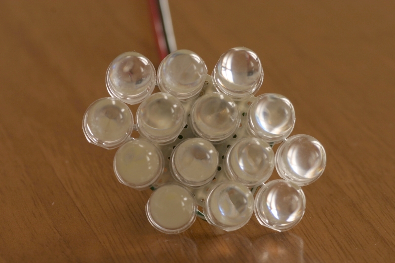 Ciao a tutti. Pubblico una delle mie soluzioni che ho realizzato per la mia mtb elettrificata. Dovendola usare anche di sera al buio, ho bisogno di un faro che illumini oltre che segnalare presenza. Ho quindi acquistato per circa 12 Euri 50 LED bianchi a 140000 mcd da 10mm di diametro. Il punto di lavoro del singolo led è a circa 20mA con caduta di circa 3.1 Volt. Ne ho messo 14 in serie realizzando una caduta totale (misurata) di 42.5Volt alla corrente di 17mA. Ecco la foto della lampada, frontalmente.