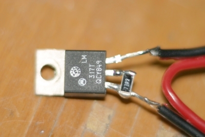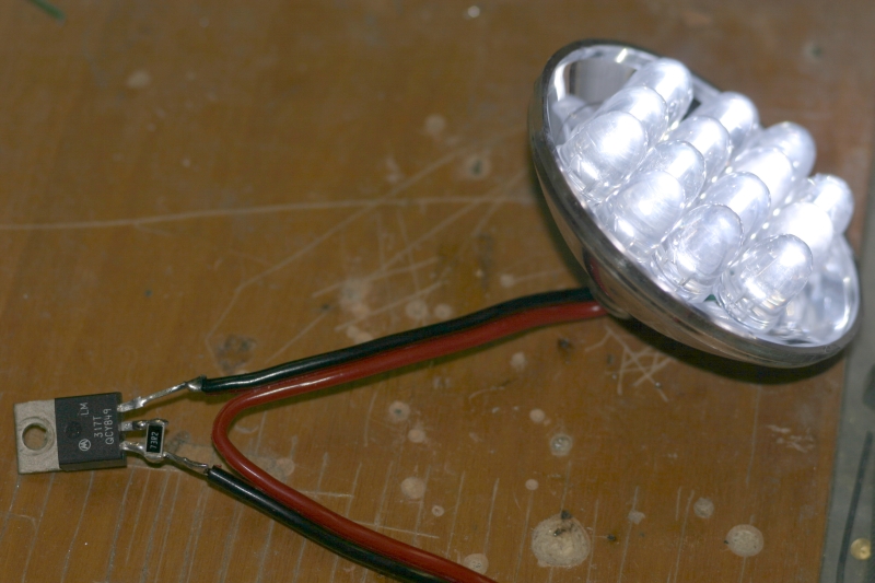 Prima di chiudere il faro, inserisco un regolatore elettronico di corrente costituito da un LM317, regolato appunto su 17mA. Sarei un po sotto il punto di lavoro ottimale, ma da misure sperimentali (esposimetro di una reflex) la luce non sembra variare di molto rispetto 20mA. Con il regolatore, il faro fa la stessa luce da 55V a 45V.