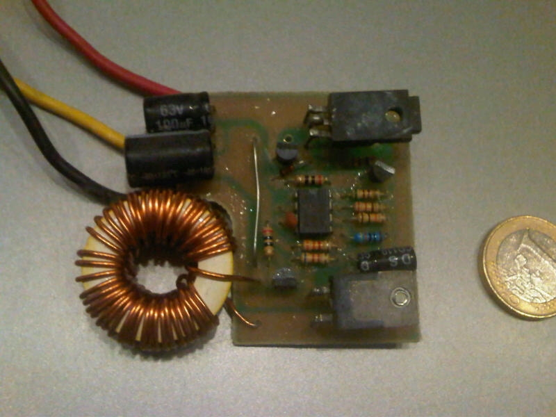 sembra realizzato con un ne555 messo in pwm... decisamente compatto, segnalo che in commercio ci sono integrati all in one che necessitano solo di toroide e qualche resistenza e condensatore (mosfet su corpo unico simil TO)  |