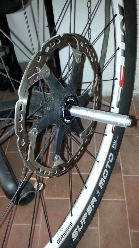 Ciao a tutti, innanzi tutto chiedo scusa per la prolungata assenza dal forum, ma problemi famigliari mi portano a dedicare al PC veramente poco tempo. Volevo documentare la mia esperienza che potrebbe venire utile a altri utenti. Ho acquistato un kit di ruote di seconda mano, sapevo che l'anteriore aveva l'attacco con perno passante mentre la mia forcella aveva attacco Quick Rapid. In un primo tempo ho pensato di raggiare il cerchio con un mozzo QR,ma pensandoci bene mi veniva a costare parecchio e non volevo spendere altri soldi, ho cercato in Internet soluzioni alternative ma non ho trovato niente, ho pensato di costruire questo adattatore e il risultato è stato ottimo, oggi ho provato su strada le nuove ruote e devo dire che tutto è stato positivo.