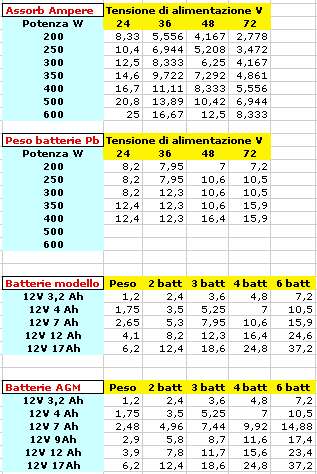 Faccio un esempio: ho un motore da 250W alimentato a 24V nella prima tabella rilevo che la corrente nominale è di 10,4A. Ora mi sposto nella seconda tabella e vedo che sempre per il 250W a 24V il peso è delle batterie è di 8,2Kg, perch èse vado alla terza tabella e cerco una batteria di 10,4A trovero' la 7Ah che non è sufficiente e poi la 12Ah, se vedo il peso accanto è di 4,1Kg se mi sposto nella seconda colonna che è quella per le 2 Batterie trovo 8,2Kg che è il valore che era nella seconda tabella.
