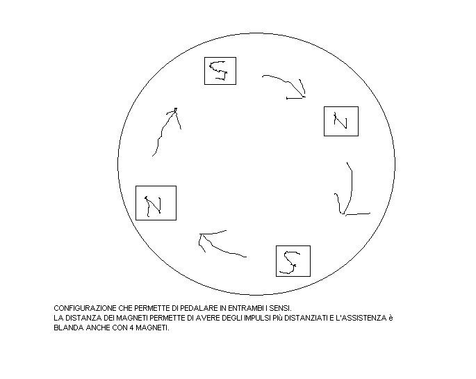 dipende dall'orientamento dei magneti! se si dispongono i magneti con il nord o il sud rivolti verso il sensore (alternati :nord sud nord sud ecc...)allora il motore si attiva pedalando in entrambi i sensi se invece si dispongono i magneti in modo che il nord o il sud siano rivolti versola freccia(sempre sud nella stessa direzione della freccia o nord nella direzione della freccia) allora il motore funzionerà pedalando solo in una direzione. Io ora per evitare che il motore si attivi anche pedalando all'indietro giro con due magneti con orientamento del nord o sud (non so bene gli ho regolati con un'altra calamita di cui ignoravo il nord o sud) verso la freccia, in questo modo ottengo un assistenza minima che mi permette di usare anche l'acceleratore come regolazione principale quando serve! allego uno schema sperando di spiegarmi bene :