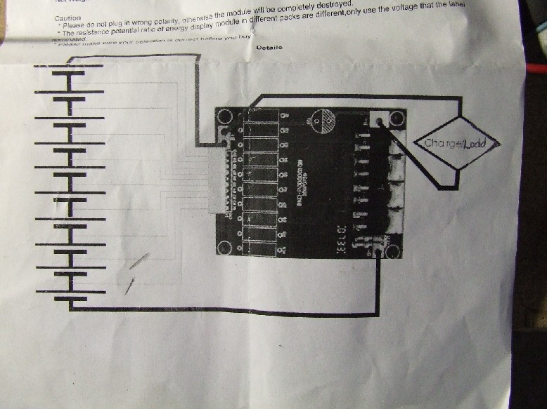 2-il montaggio del BMS è molto semplice, si deve seguire lo schema elettrico allegato, in pratica ci sono due fili rosso + e nero - da saldare al pacco batteria, dove vengono forniti i 36 V, e altri 2 fili sono da collegare al controller. Poi ci sono 10 fili bianchi che vanno saldati ai vari gruppi di celle ( da 15 caduno) quindi a 0.0V, 3.6V, 7.2V, ..., 36.0V
