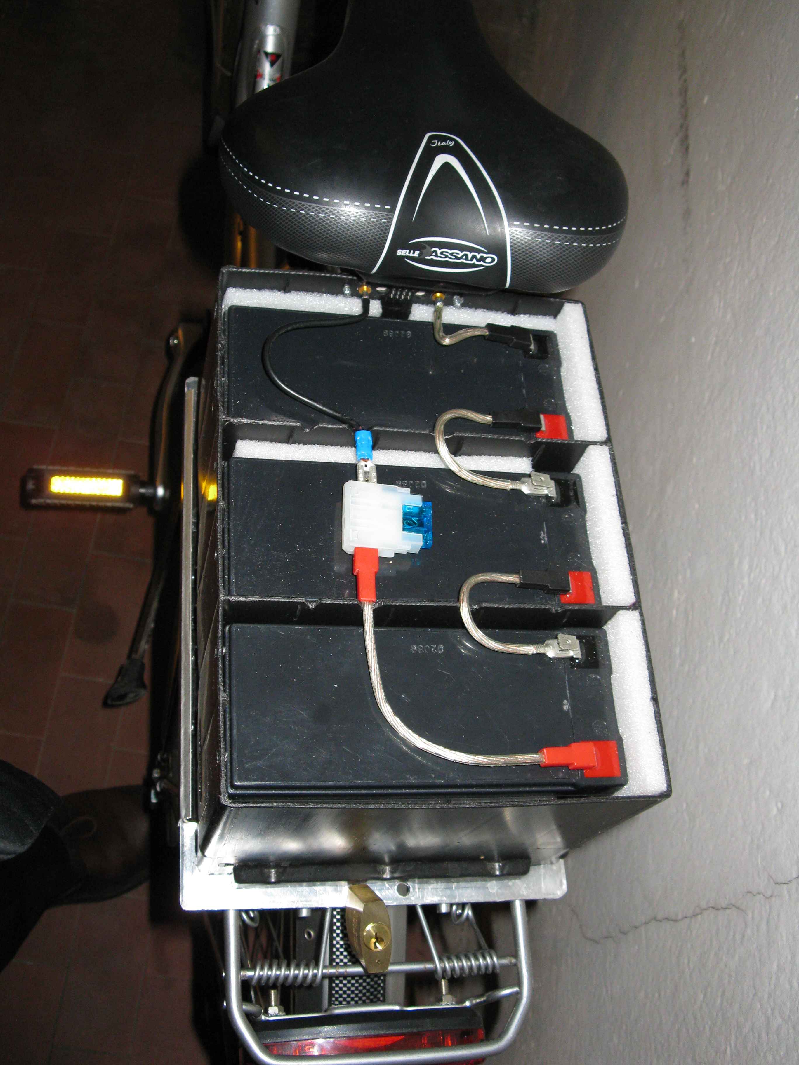 grazie a tutti per le informazioni, controllero` con calamita e calibro ma credo proprio che sia alu da 1"1/8 (cosi` mi disse il venditore). Poi decidero` se mettere dei semplici rinforzi per i forcellini. Per Henka allego una foto della batteria: ho usato l'involucro (5€) di un 12V 65A togliendo 2 diaframmi, e` interessante che ogni scomparto e` largo circa 70mm cosi` ci potrebbero stare eventualmente anche le varie 18650, 26650 etc. Il lucchetto serve ad evitare che proprio uno se la possa portar via senza la minima fatica. Sto anche valutando dei contatti striscianti per eliminare il connettore ed un BMS ad hoc. ciao